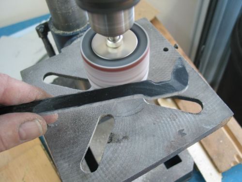 | I secured the G10 in a vise and used a metal saw to roughly cut out the brace (fig.8). Then I removed most of the material on a bench grinder, being just shy of the scoar marks (fig. 9) |